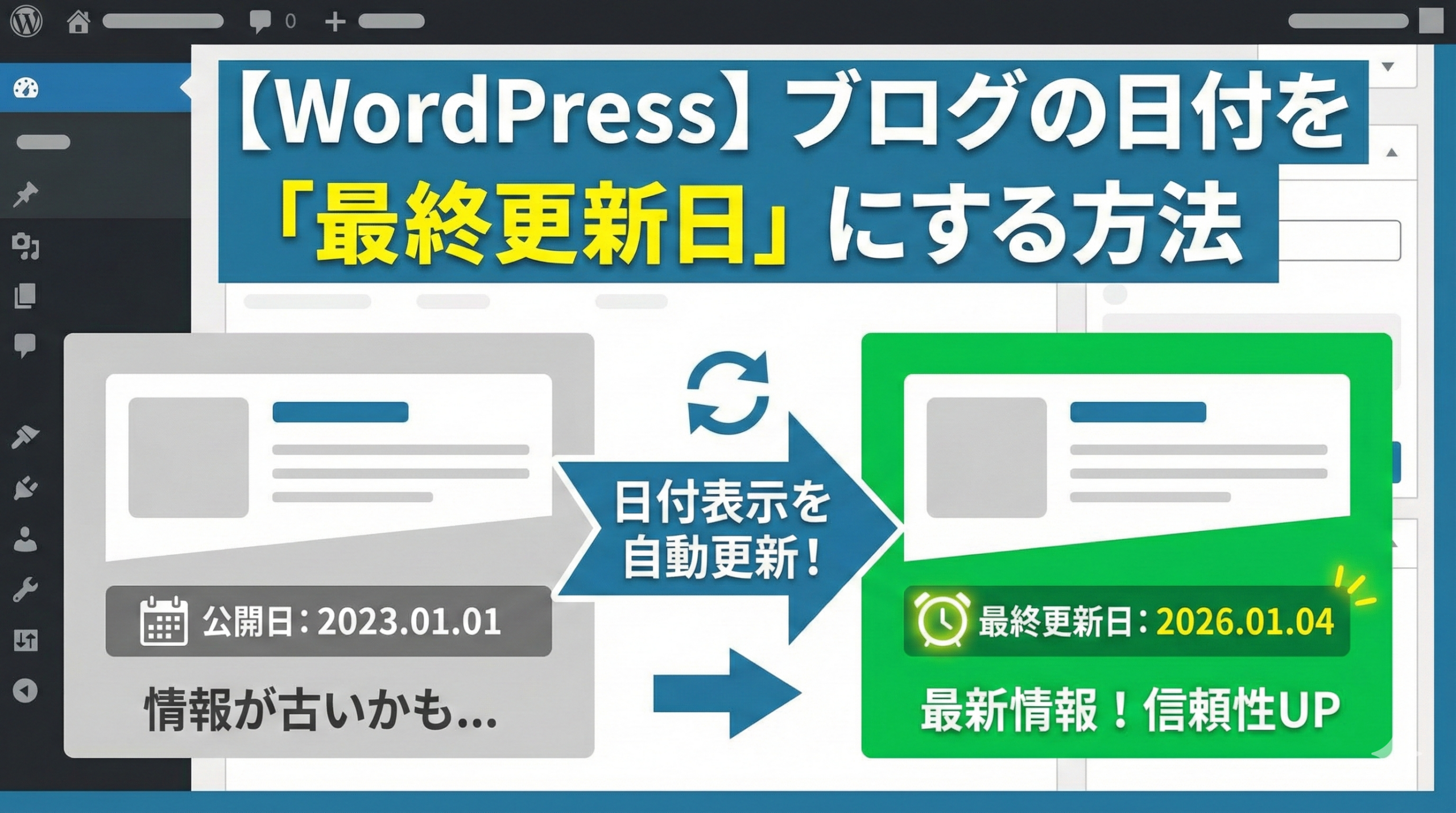 ブログ記事をリライトしたのに、日付が古いままになっていませんか? 読者に「最新情報だ」と伝えるためには、日付を「公開日」から「更新日」に変えるのが効果的です。
