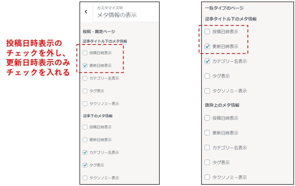 - SWELLの場合: 「外観」→「カスタマイズ」→「投稿・固定ページ」→「記事下・タイトル・メタ情報」→「表示する日付」で「更新日」を選択。