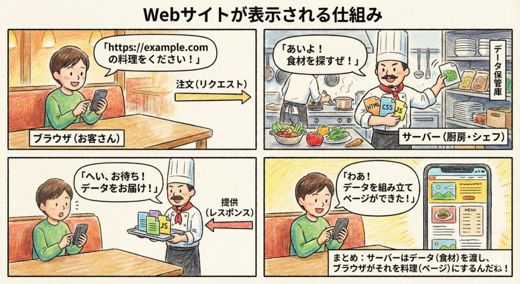 Webブラウザ(お客さん): ChromeやSafariなど。あなた(ユーザー)の代わりに注文をする人。
