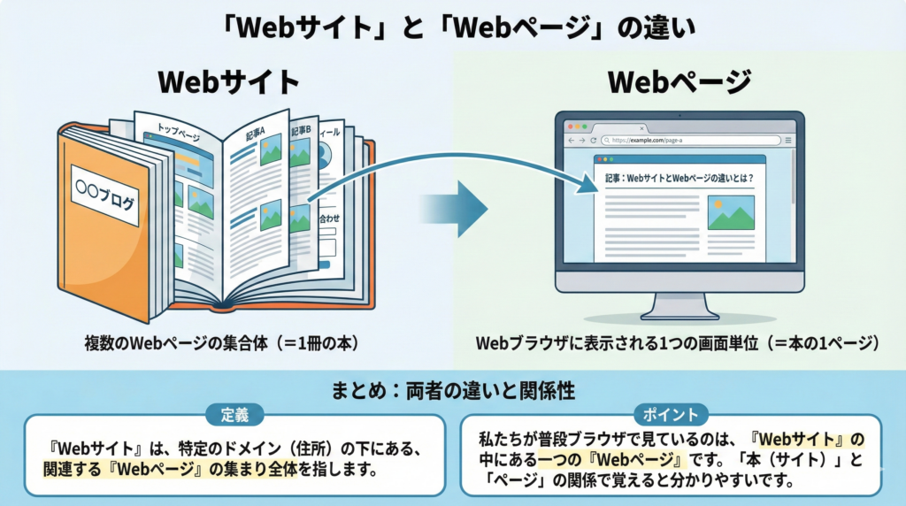 まず最初に、よく混同されやすい 「Webサイト」と「Webページ」 の違いを明確にしておきましょう。