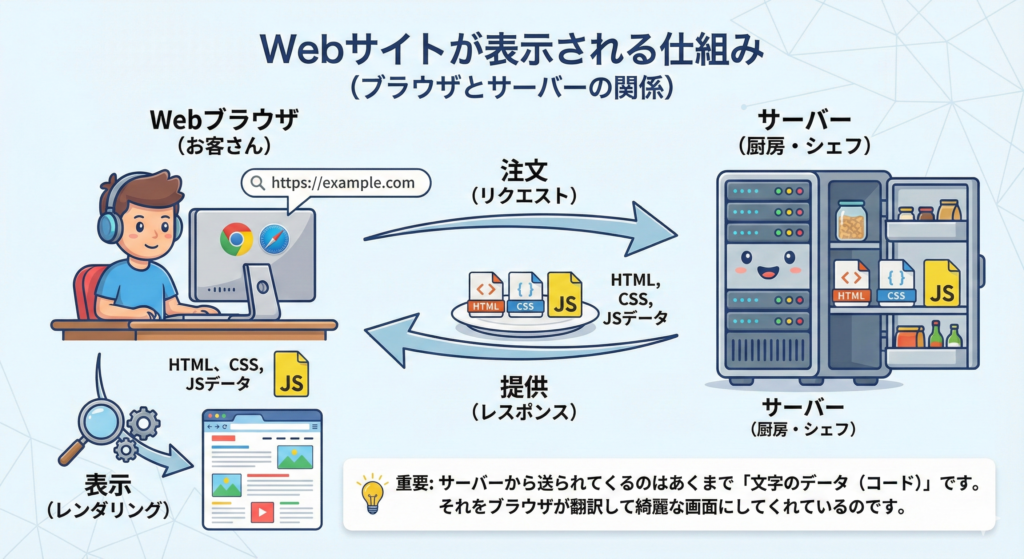 重要: サーバーから送られてくるのはあくまで「文字のデータ(コード)」です。それをブラウザが翻訳して綺麗な画面にしてくれているのです。