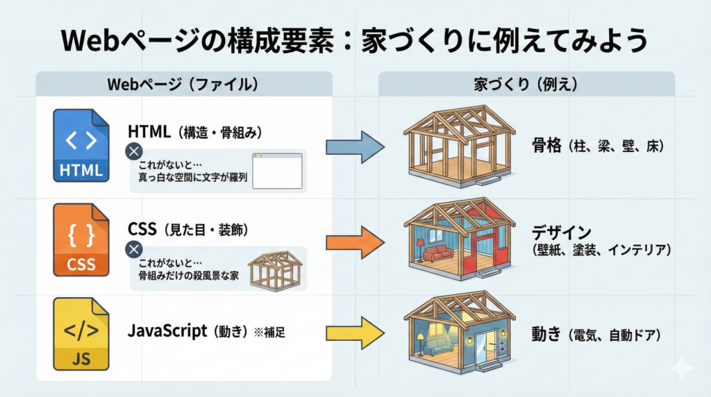 Webページを構成するファイルは、主に以下の2つ(+α)です。 これを「家づくり」に例えてみましょう。