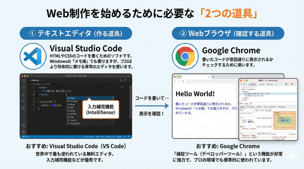 - 必要な道具は「VS Code」と「Chrome」があればOK(無料!)。